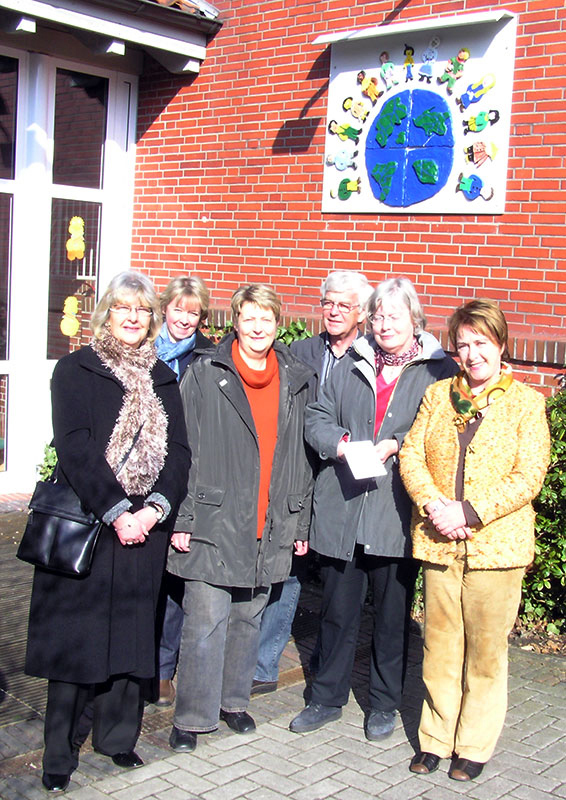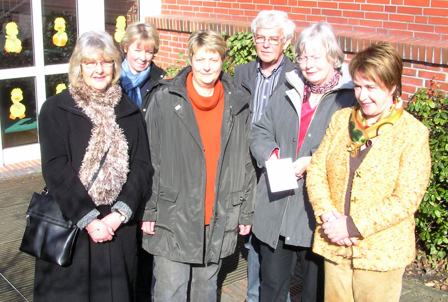 Team der Integrationsklasse der Grundschule am Harlinger Weg im Beisein von Frau Dankwardt und Herrn Hallmann eine Spende von 500 Euro des Lions-Clubs Schortens. |