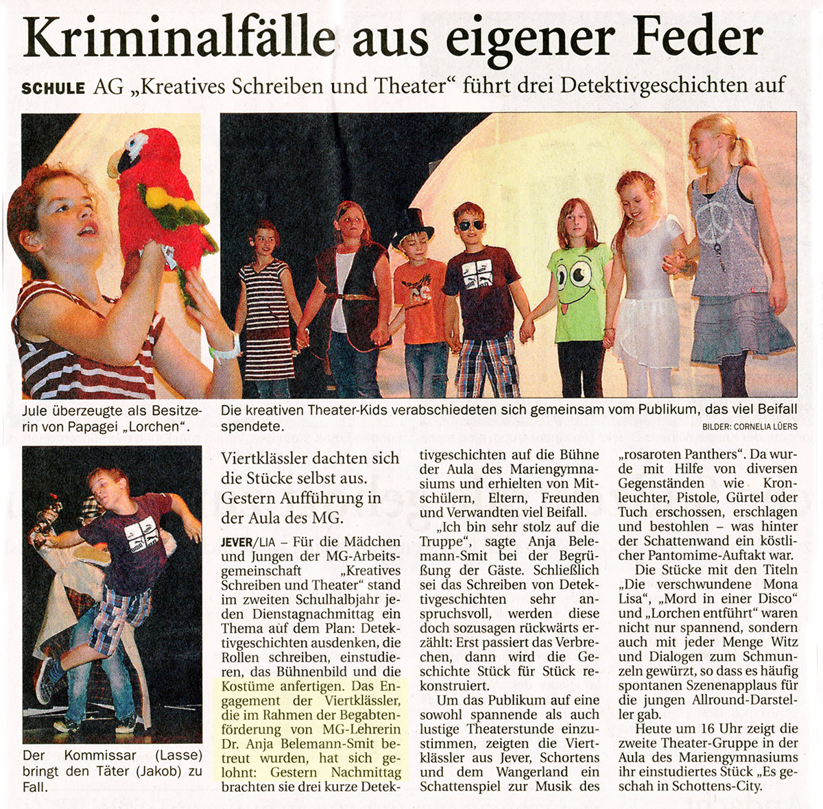 Kinder aus 4. Klassen präsentieren am Mariengymnasium Kriminalfälle aus eigener Feder Jeversches Wochenblatt, 19.6.2013 |