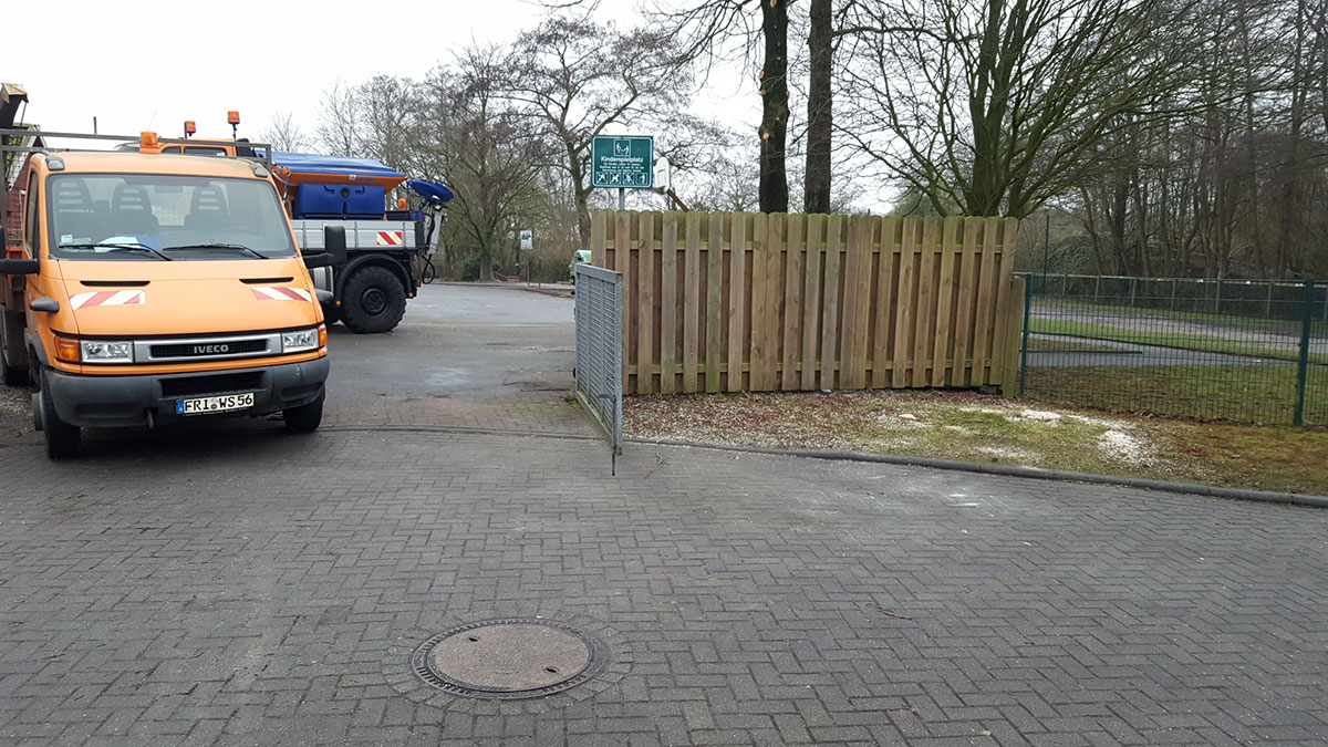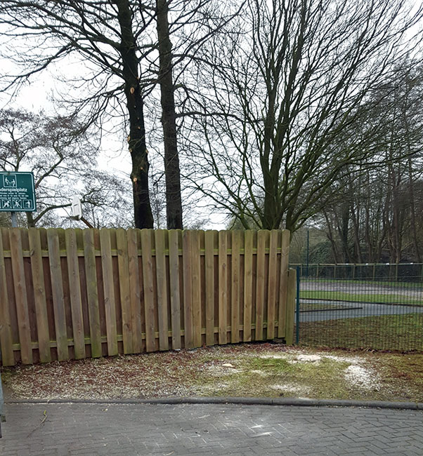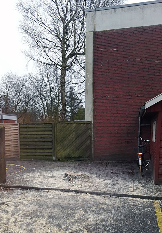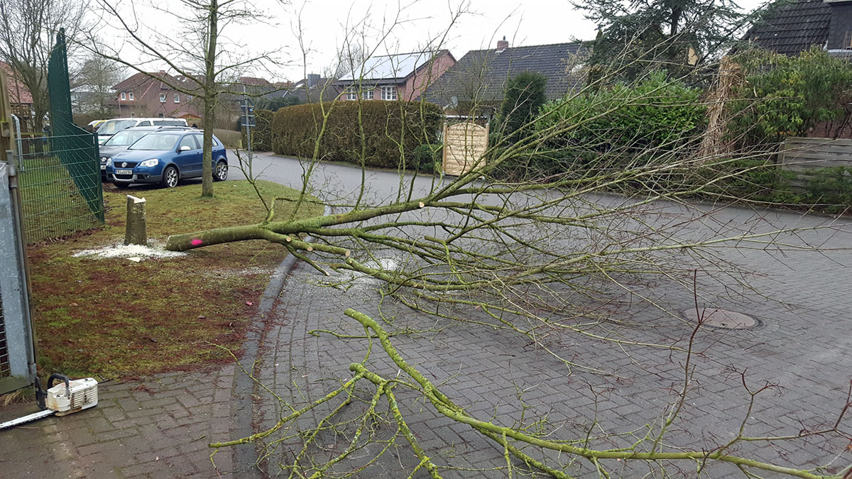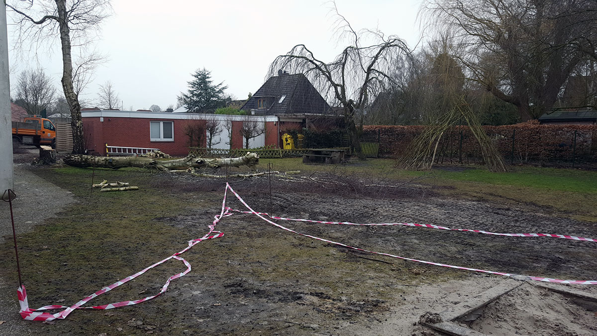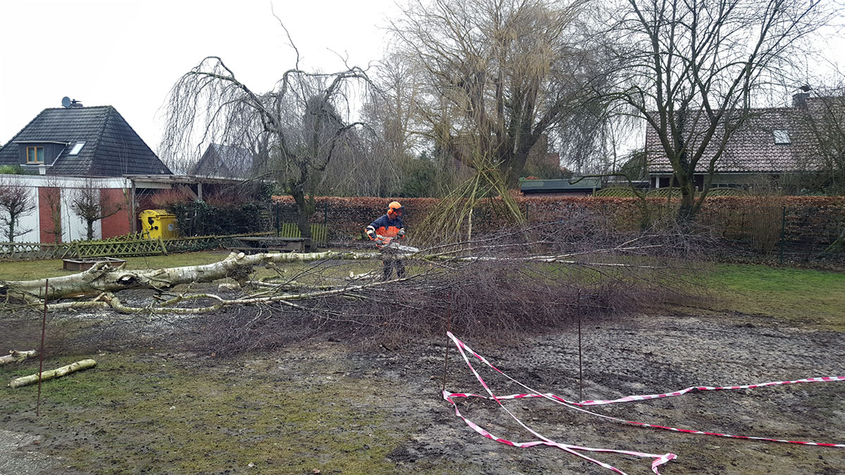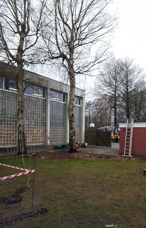 Die unteren Äste werden abgesägt, da die Einfahrt zum Schulhof verlegt werden muss. |
