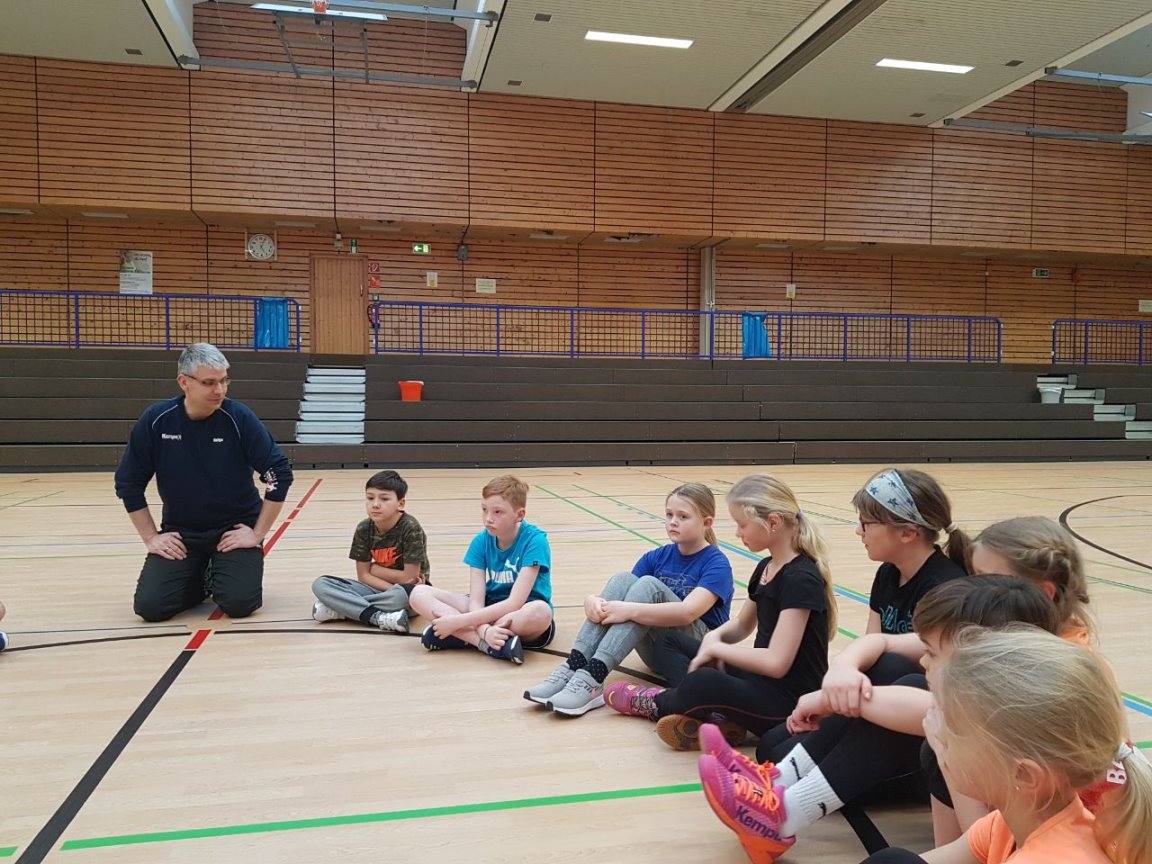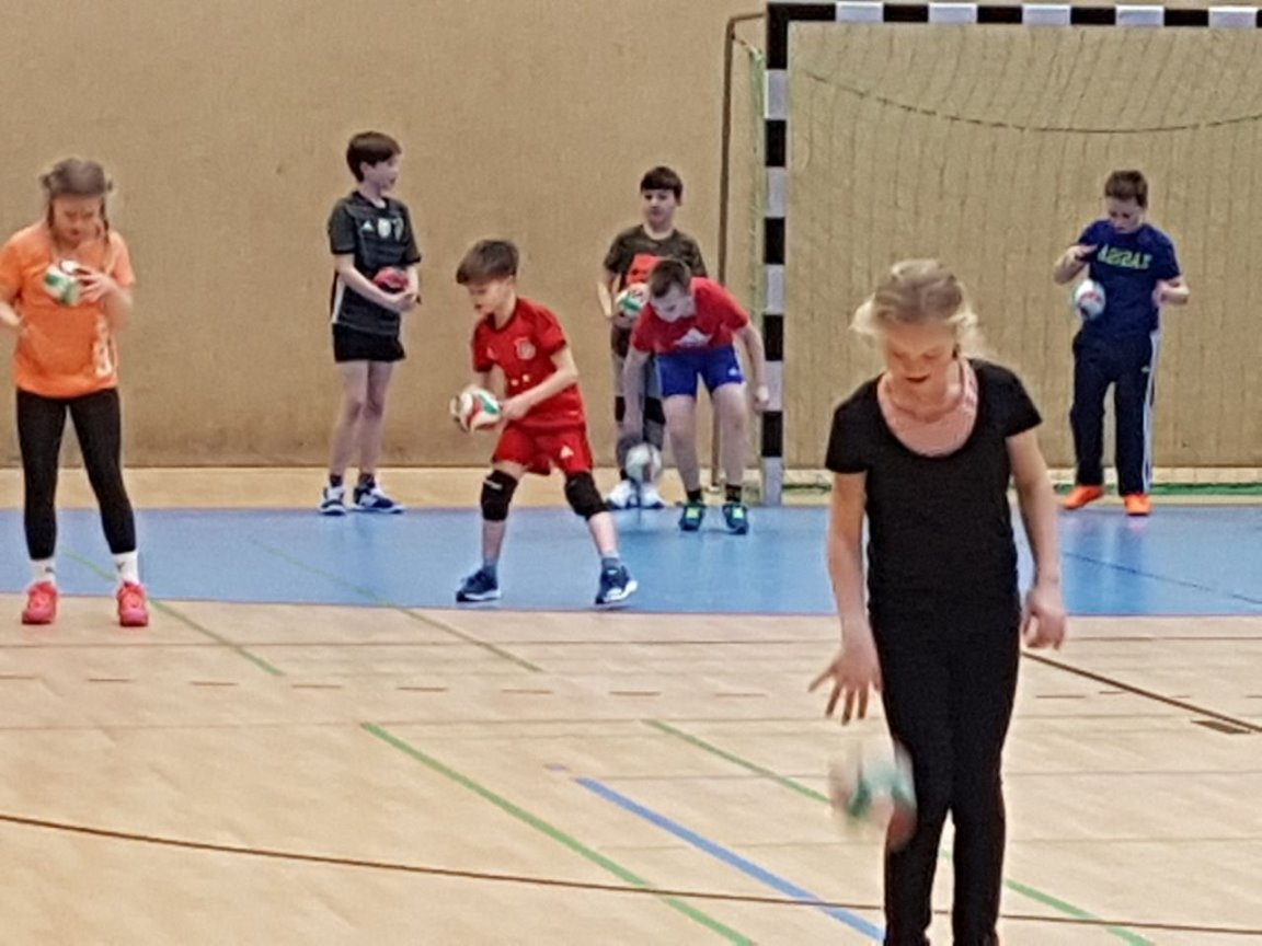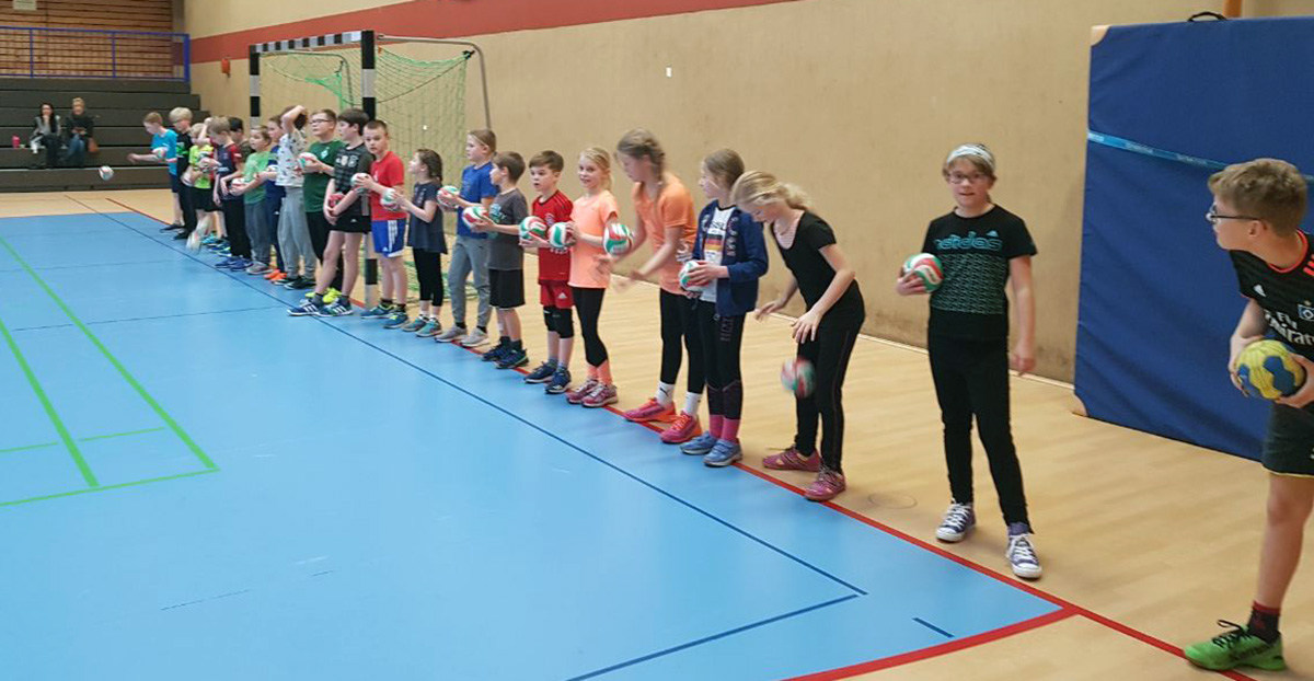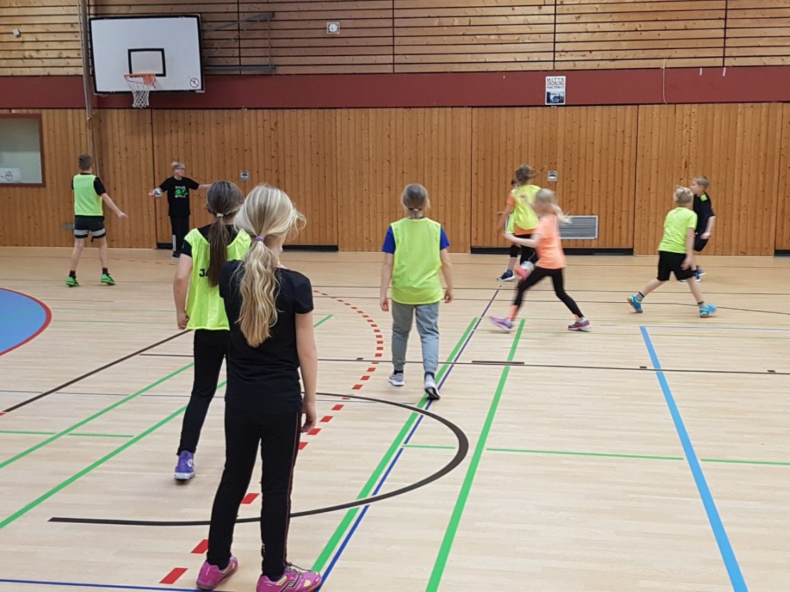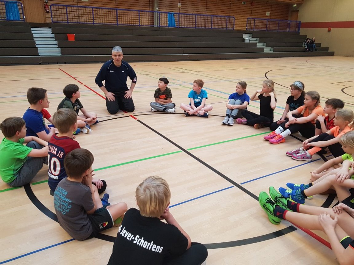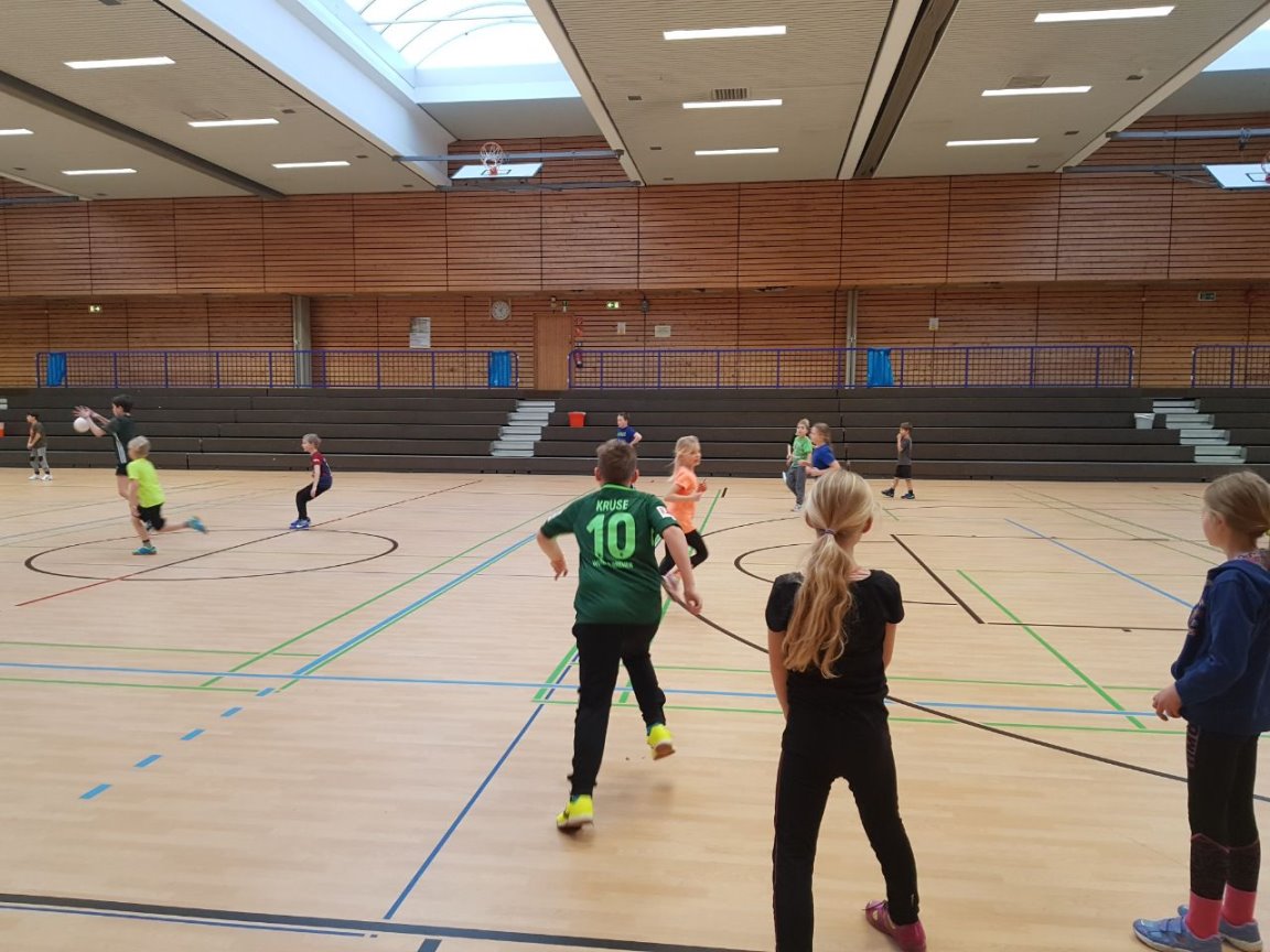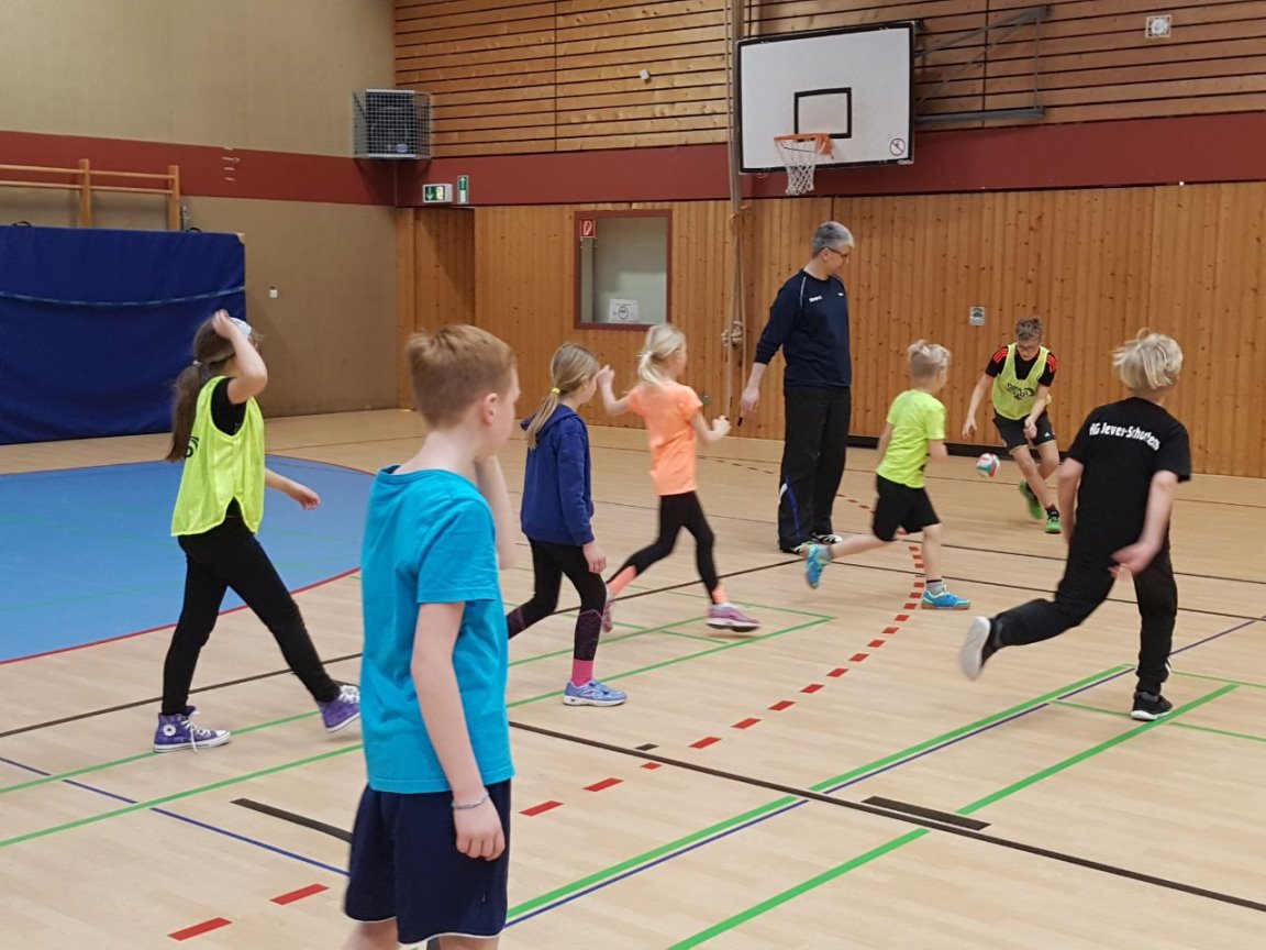 Da unsere Schule zur Zeit keine Turnhalle hat, nahm Frau Simon-Lübbenauf Einladung der HG-Jever-Schortensan einem Handballtraining teil. |