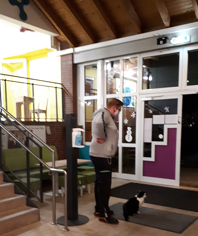 21.01.2021 | Unsere "Schulkatze" hat sich, nach gewissenhafter Inspizierung des Altbaus, in einen Sitzstreik aufgrund unzumutbarer Witterungsverhältnisse begeben. Erst Leckerli-Zuwendungen unseres Katzenflüsterers haben sie überzeugen können sich nach draußen zu begeben... zumindest genau so lange, bis das Leckerchen aufgefuttert war und das nächste Kind die Tür wieder öffnete.... |