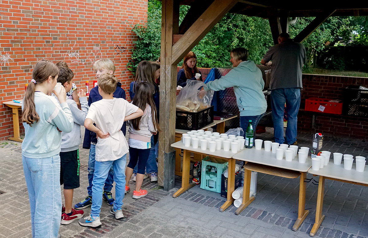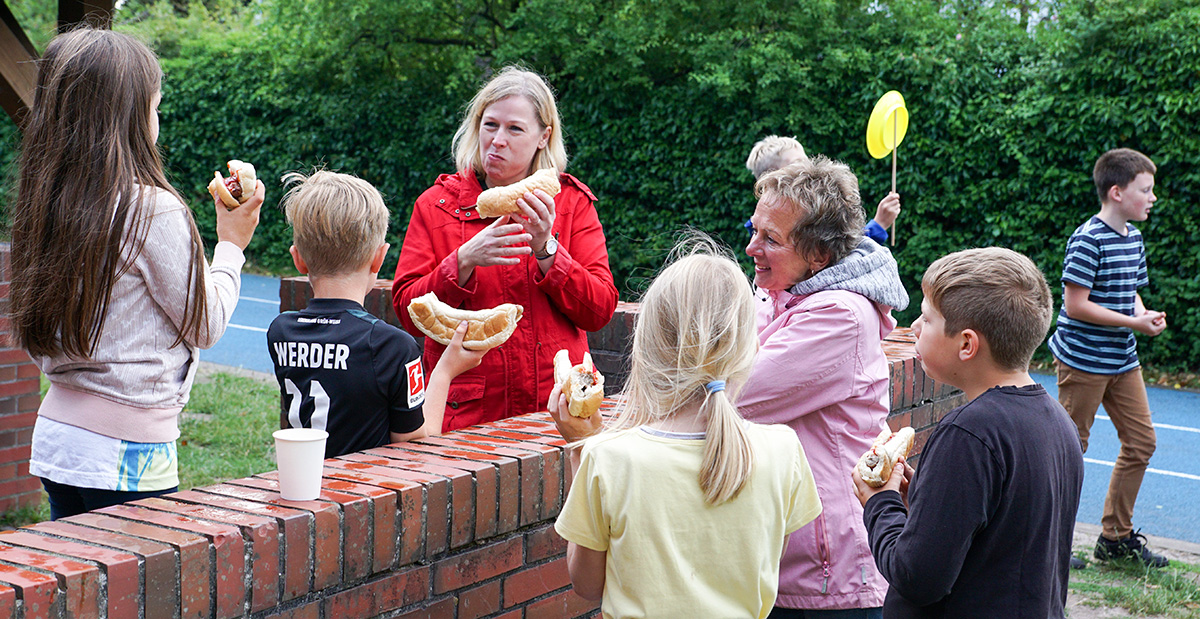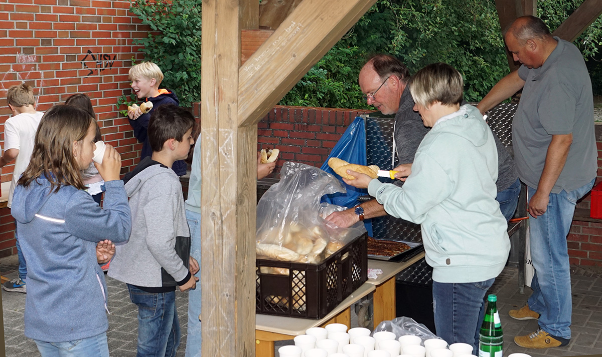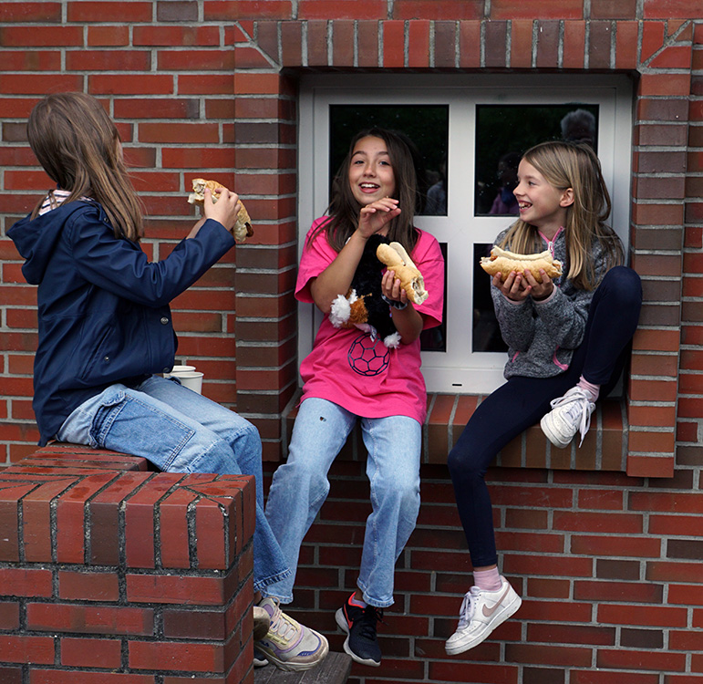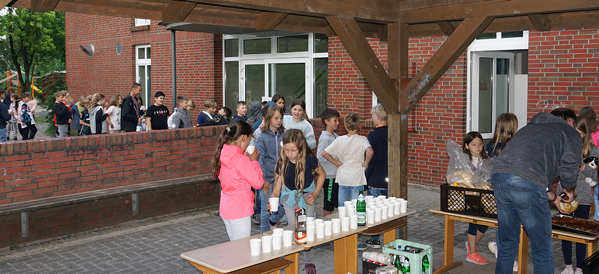 Nachdem die Würstchen des Fördervereins verspeist sind, gehen die 3. und 4. Klassen zur Filmvorführung in den Lokschuppen. |
