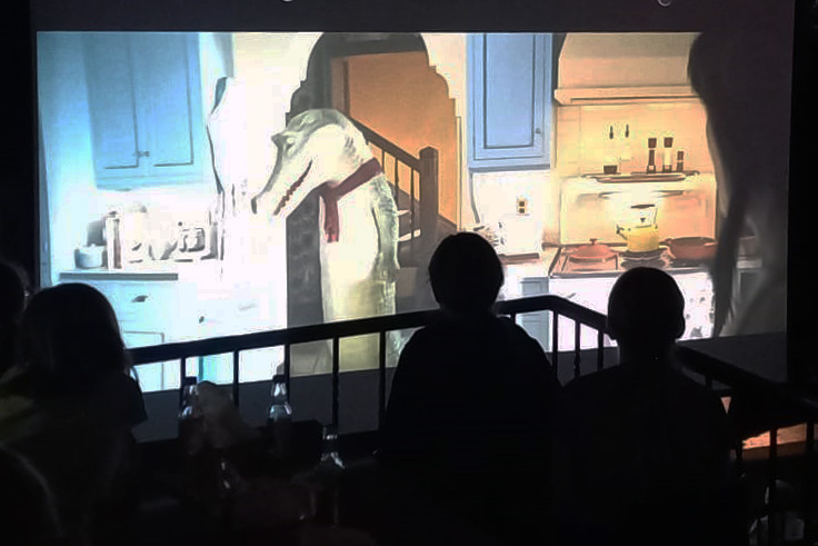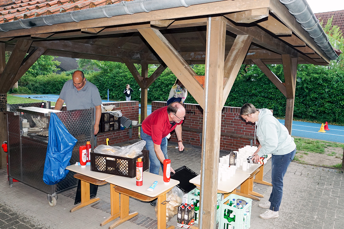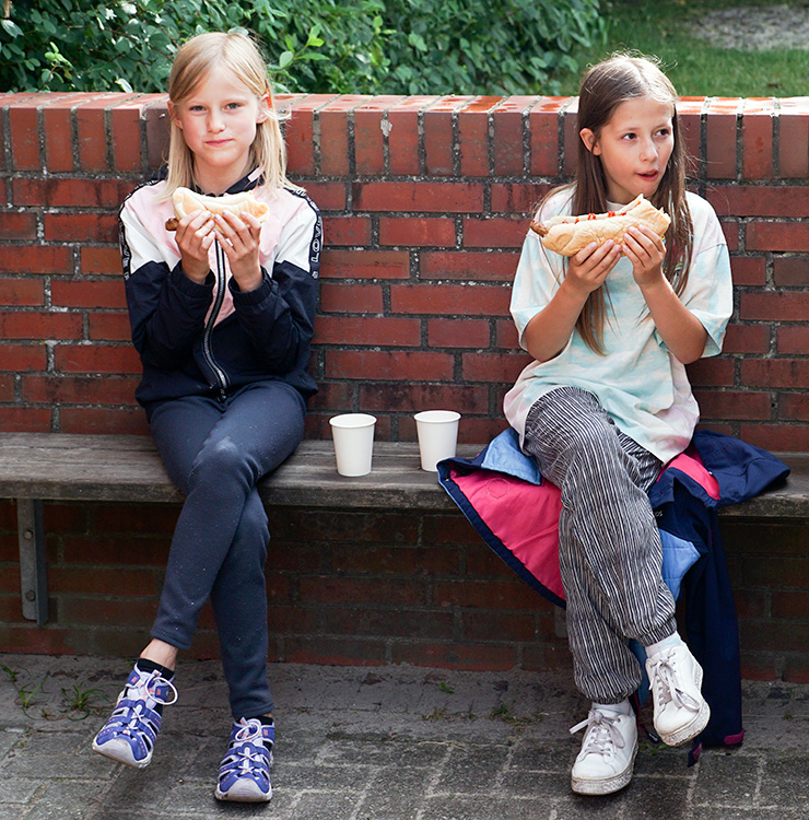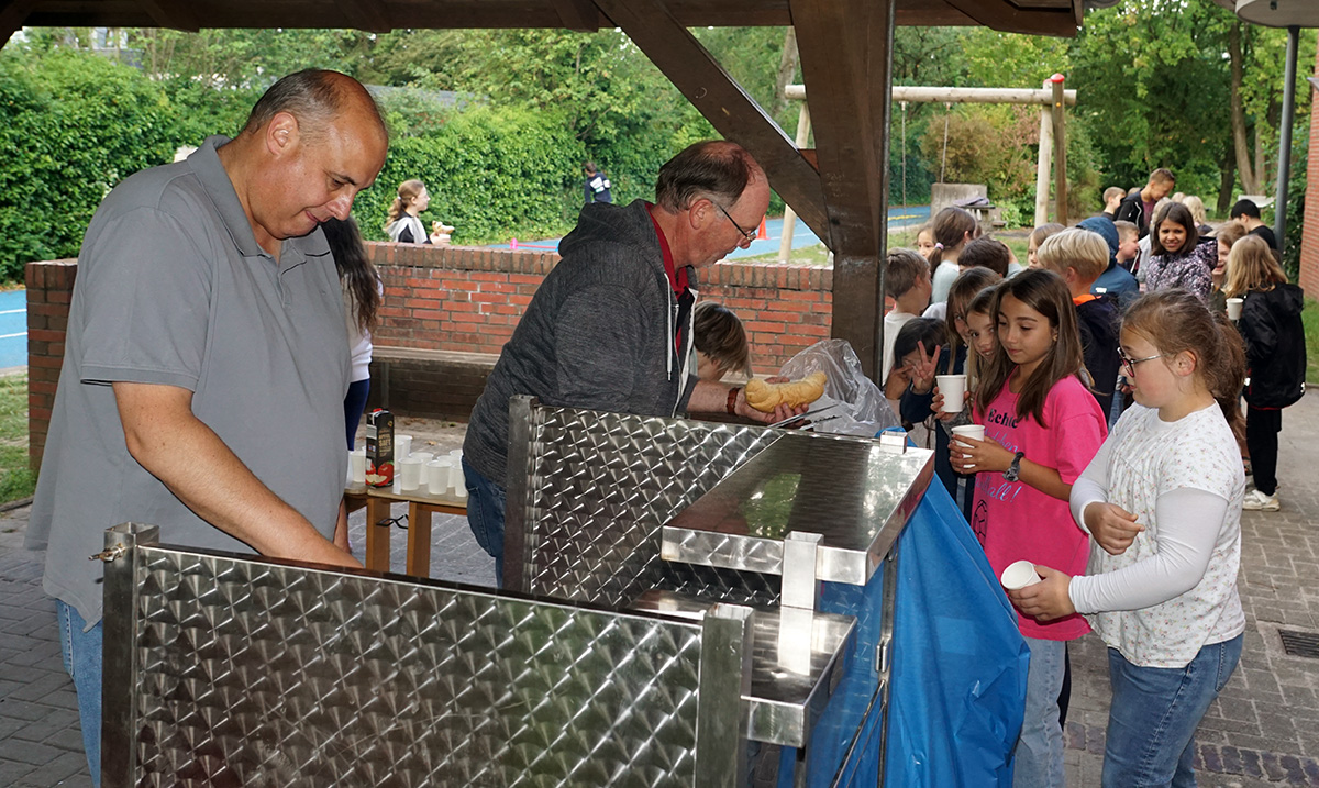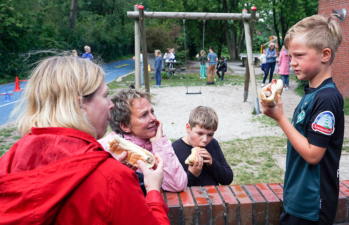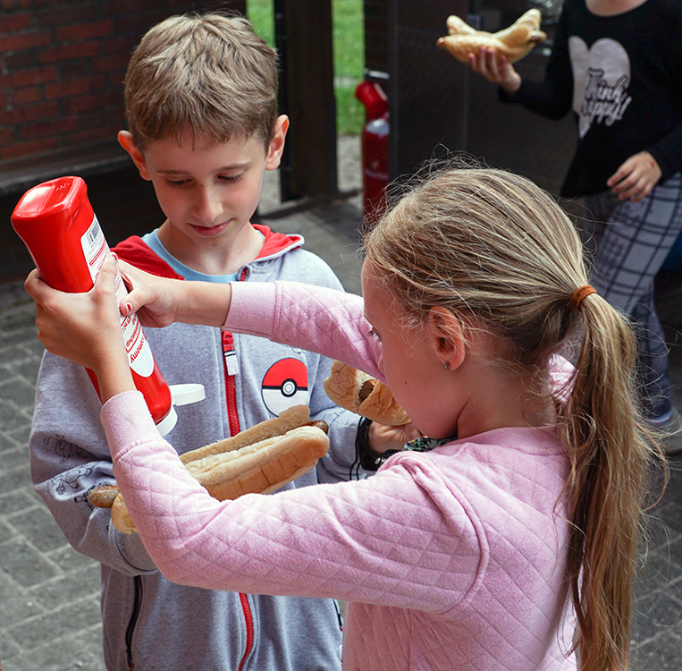 Nachdem die Würstchen des Fördervereins verspeist sind, gehen die 3. und 4. Klassen zur Filmvorführung in den Lokschuppen. |