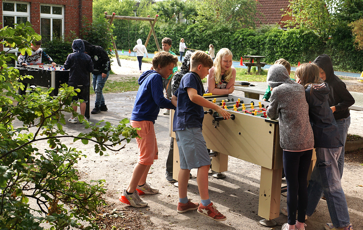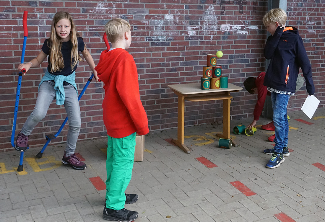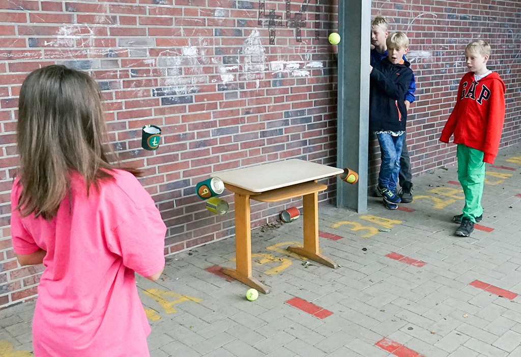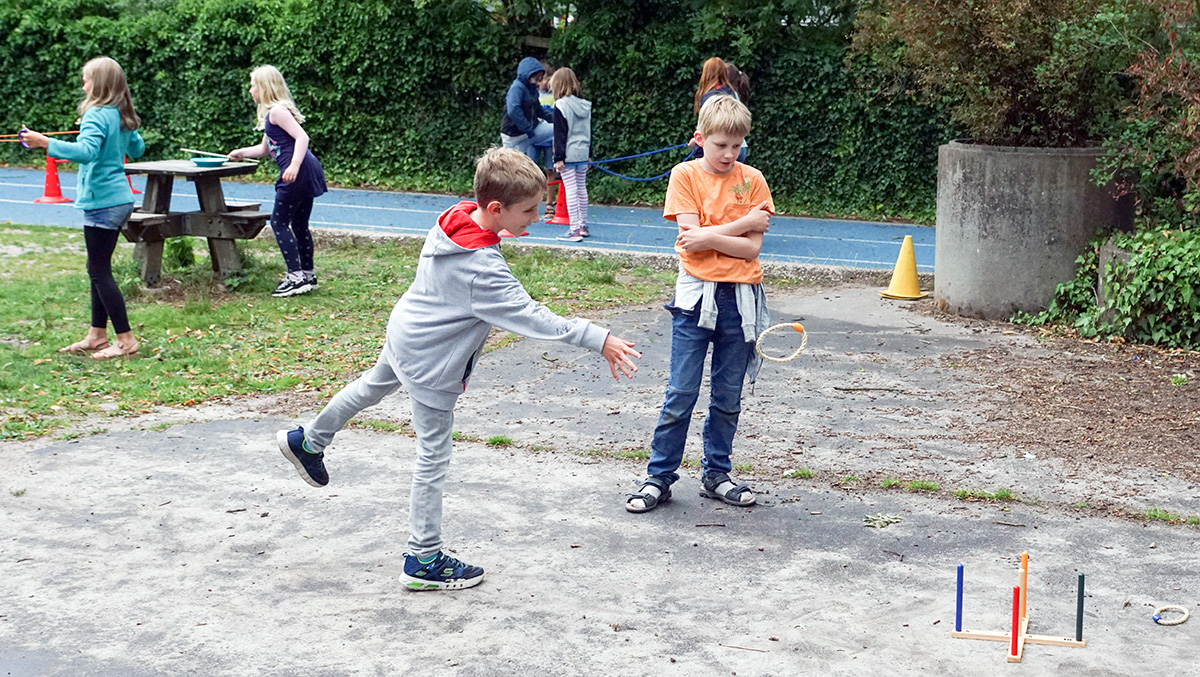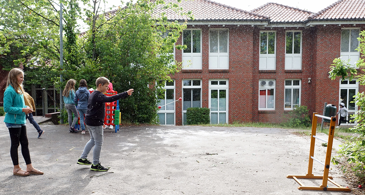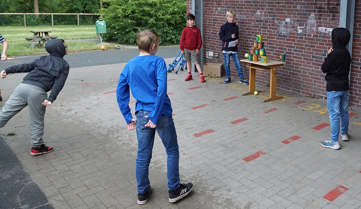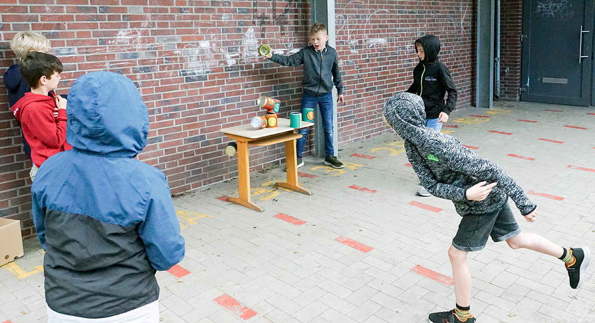 Während die Klassen 1 und 2 im Kino sind, spielen Klassen 3 und 4 auf dem Schulhof. |