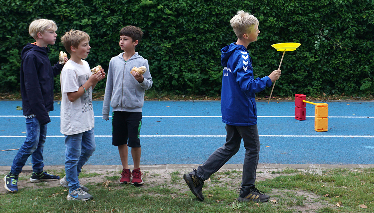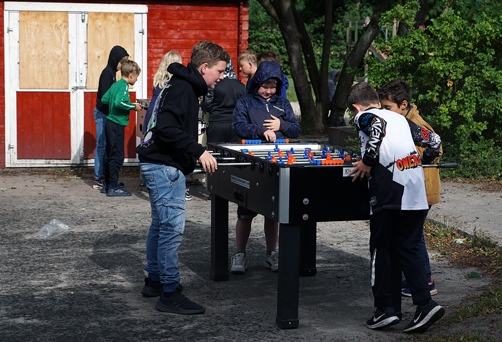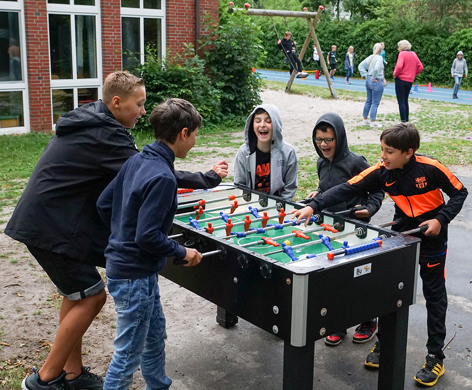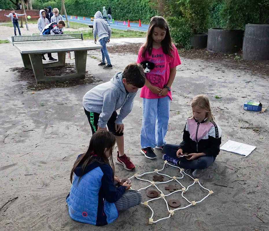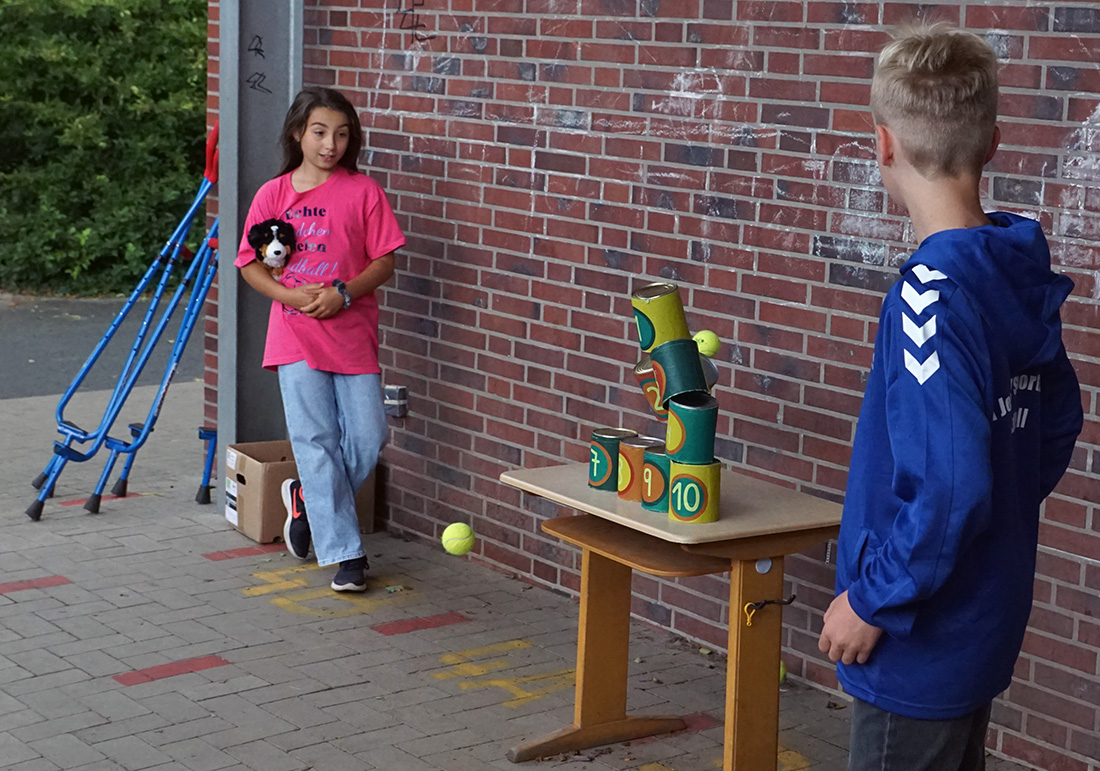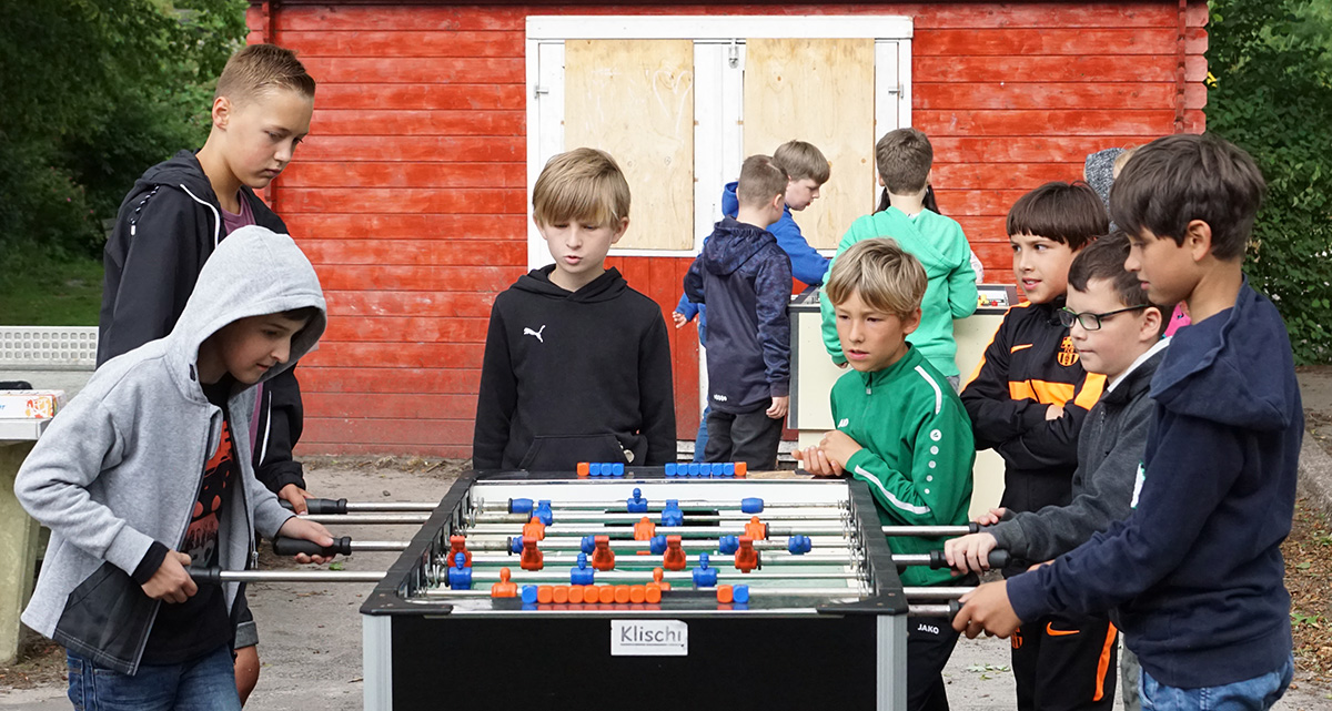 Während die Klassen 1 und 2 im Kino sind, spielen Klassen 3 und 4 auf dem Schulhof. |