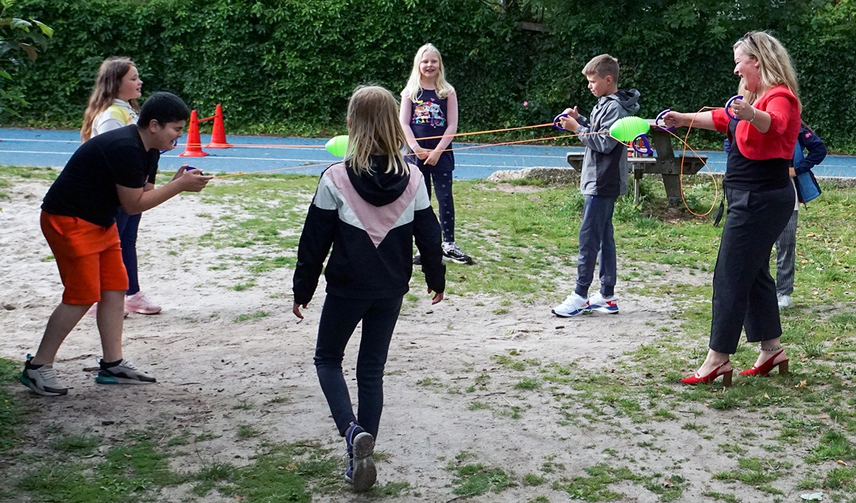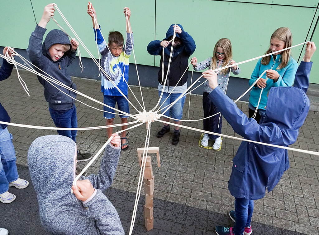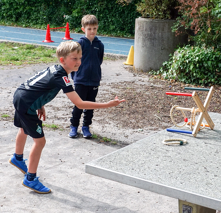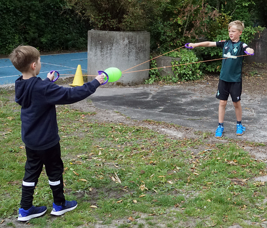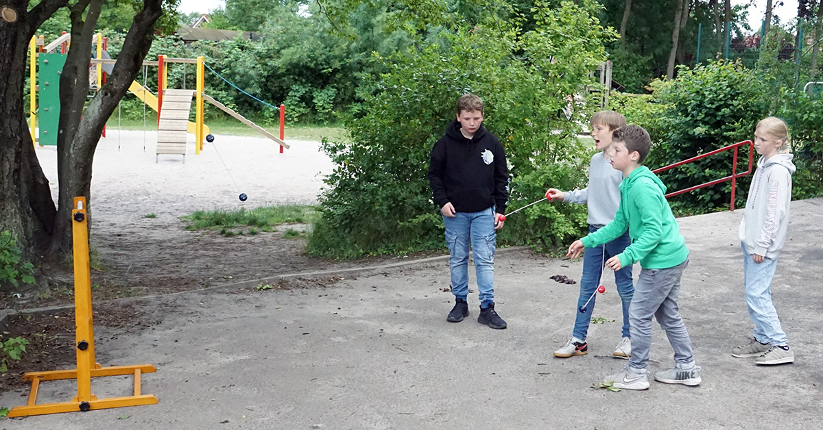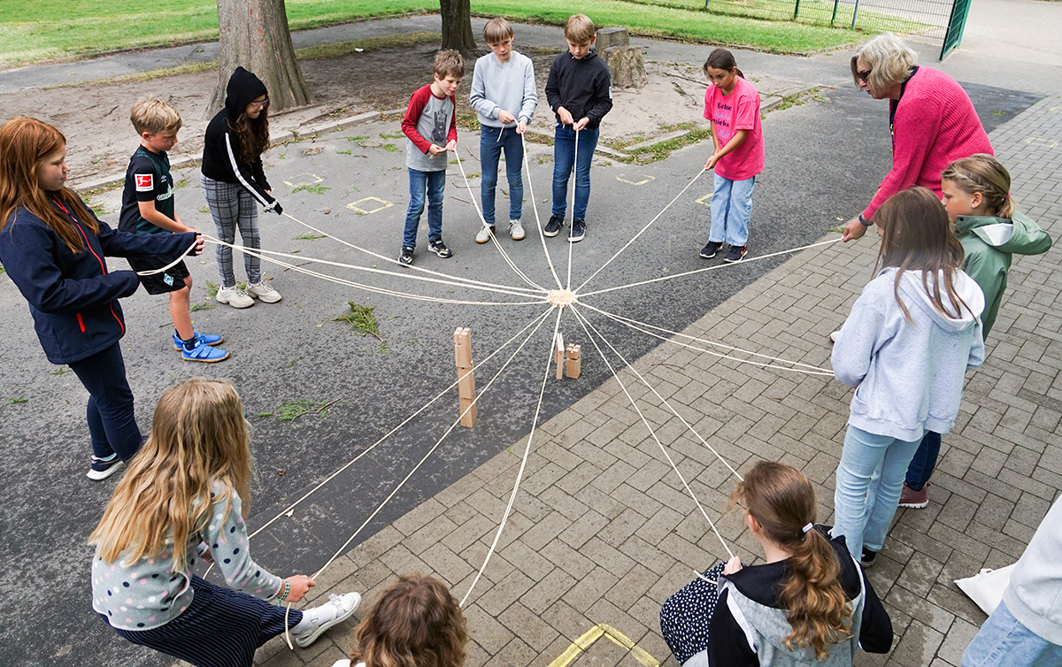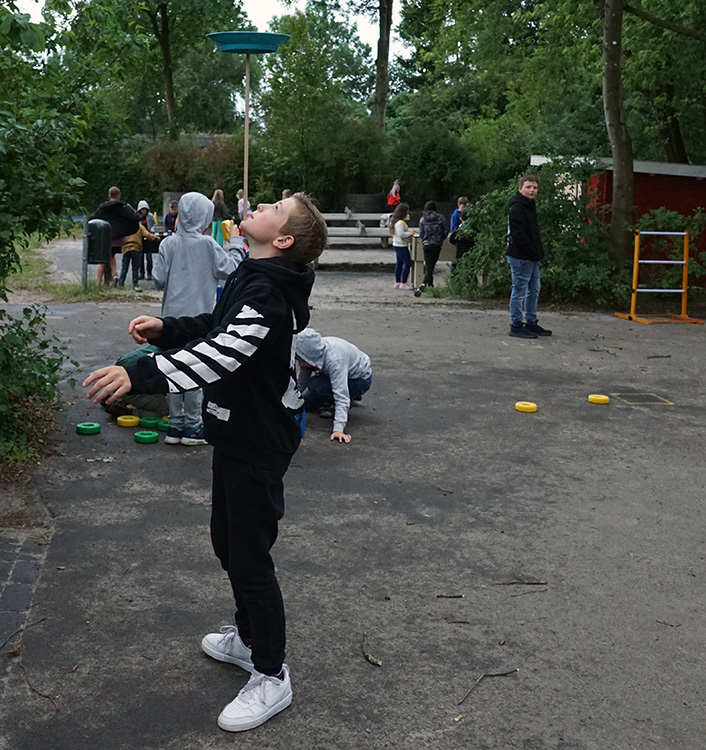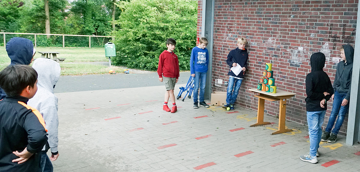Während die Klassen 1 und 2 im Kino sind, spielen Klassen 3 und 4 auf dem Schulhof. |