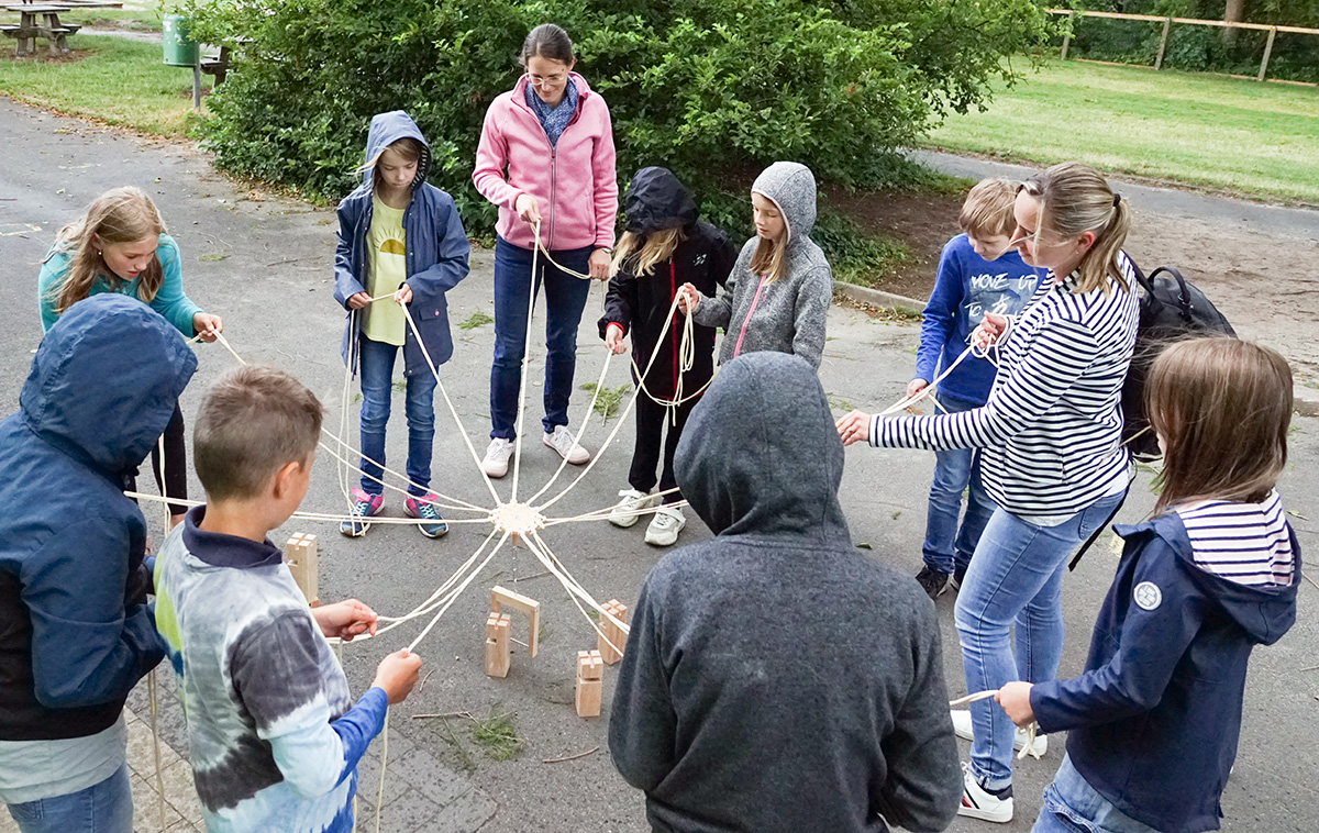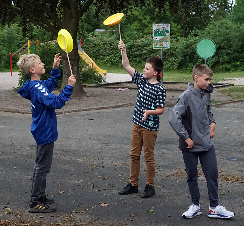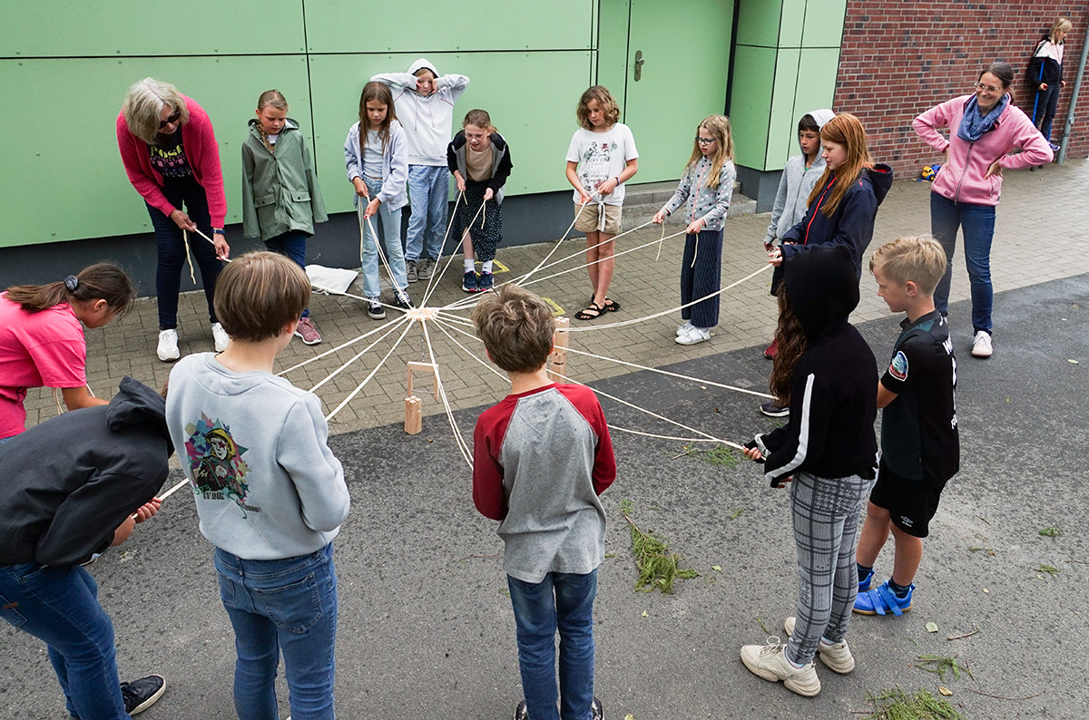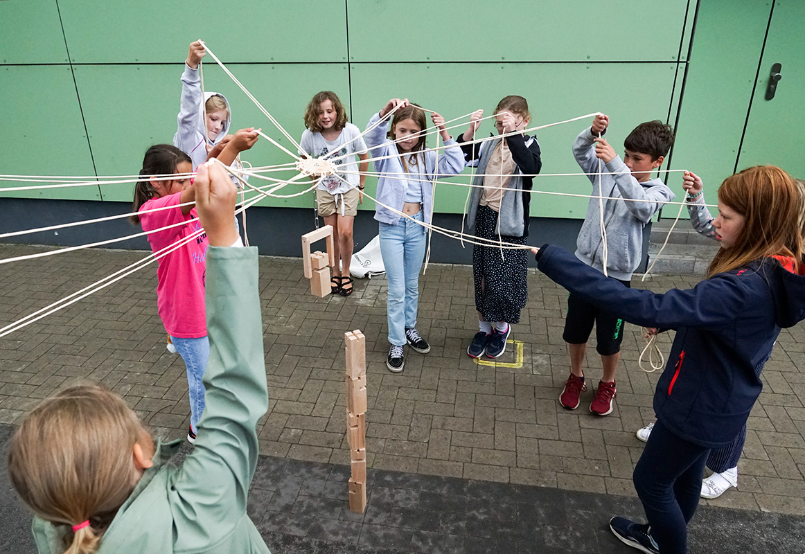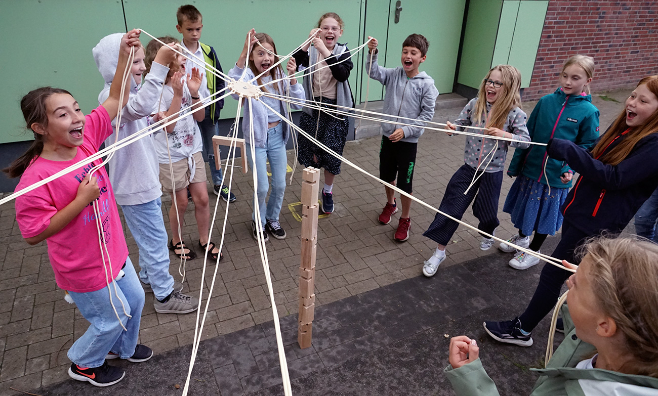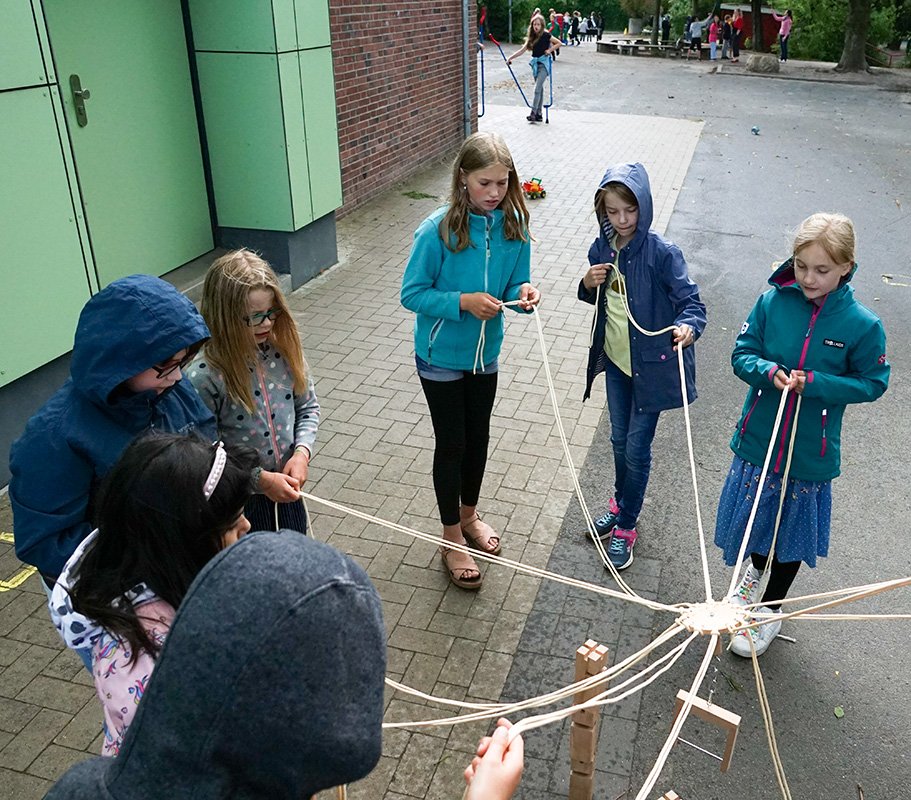 Während die Klassen 1 und 2 im Kino sind, spielen Klassen 3 und 4 auf dem Schulhof. |